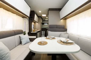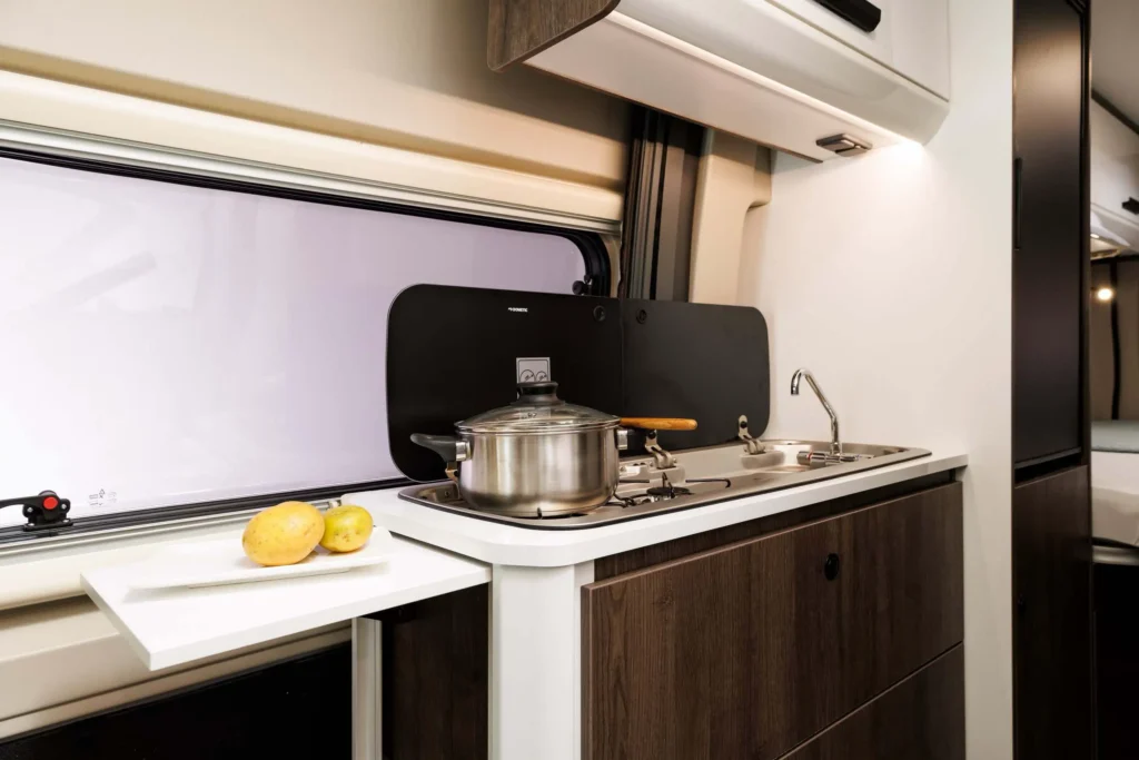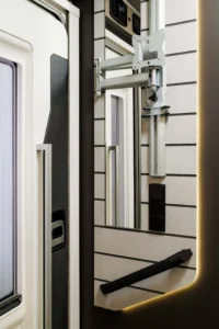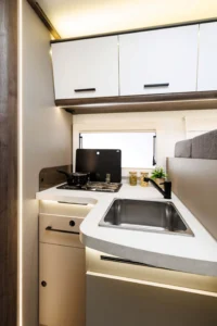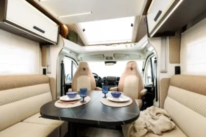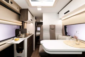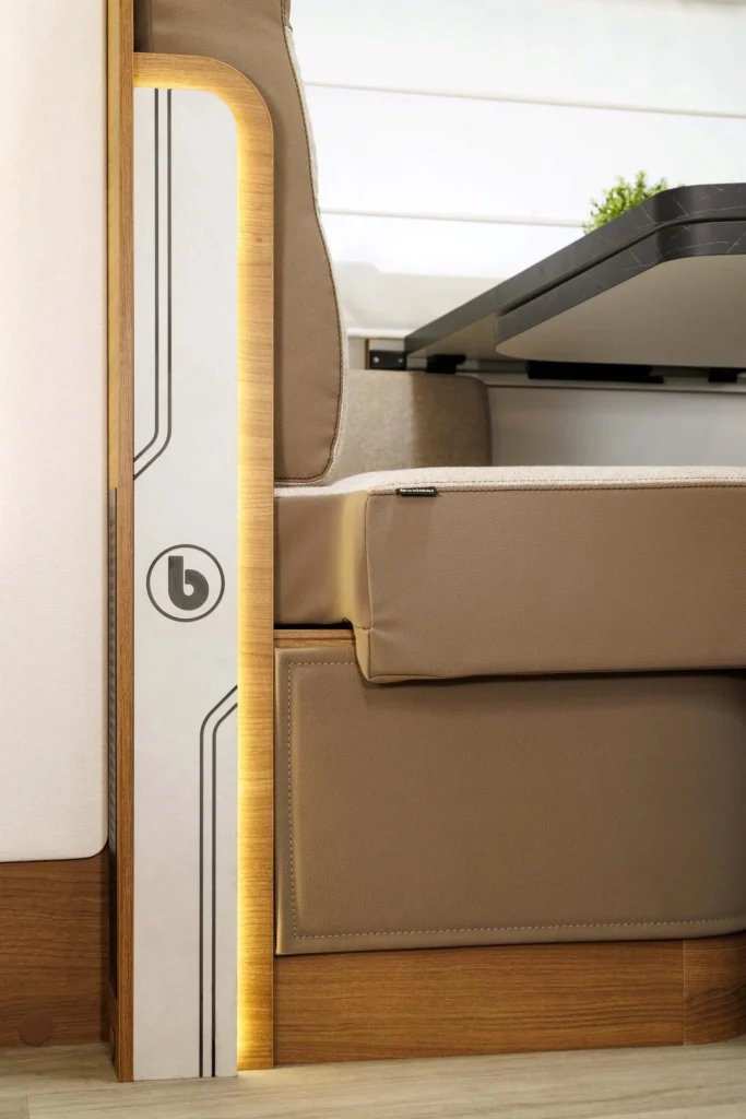Kaj so UP izvedbe? UP modeli so cenovno zelo dostopni in pripravljeni za takojšnjo uporabo na poti. Na voljo so v točno določeni konfiguraciji, kar pomeni, da ni mogoče dodajati ali odvzemati paketov. Dodana je oprema, ki na poti resnično pride prav: tenda, 140 W sončna celica, antena, 20” TV, travel kit, vzvratni senzorji, akumulator. Zaradi ugodnejše cene pa so odvzeti nekateri detajli, ki nimajo tako velike uporabne vrednosti oziroma niso vsem pomembni. Tako je v UP izvedbah prednji odbijač v črni barvi, sedeži niso v barvi oblazinjenja, ni bočne osvetlitve, prav tako ni ambientne osvetlitve in meglenk spredaj. Vse UP izvedbe imajo mizo sidrano v steno.