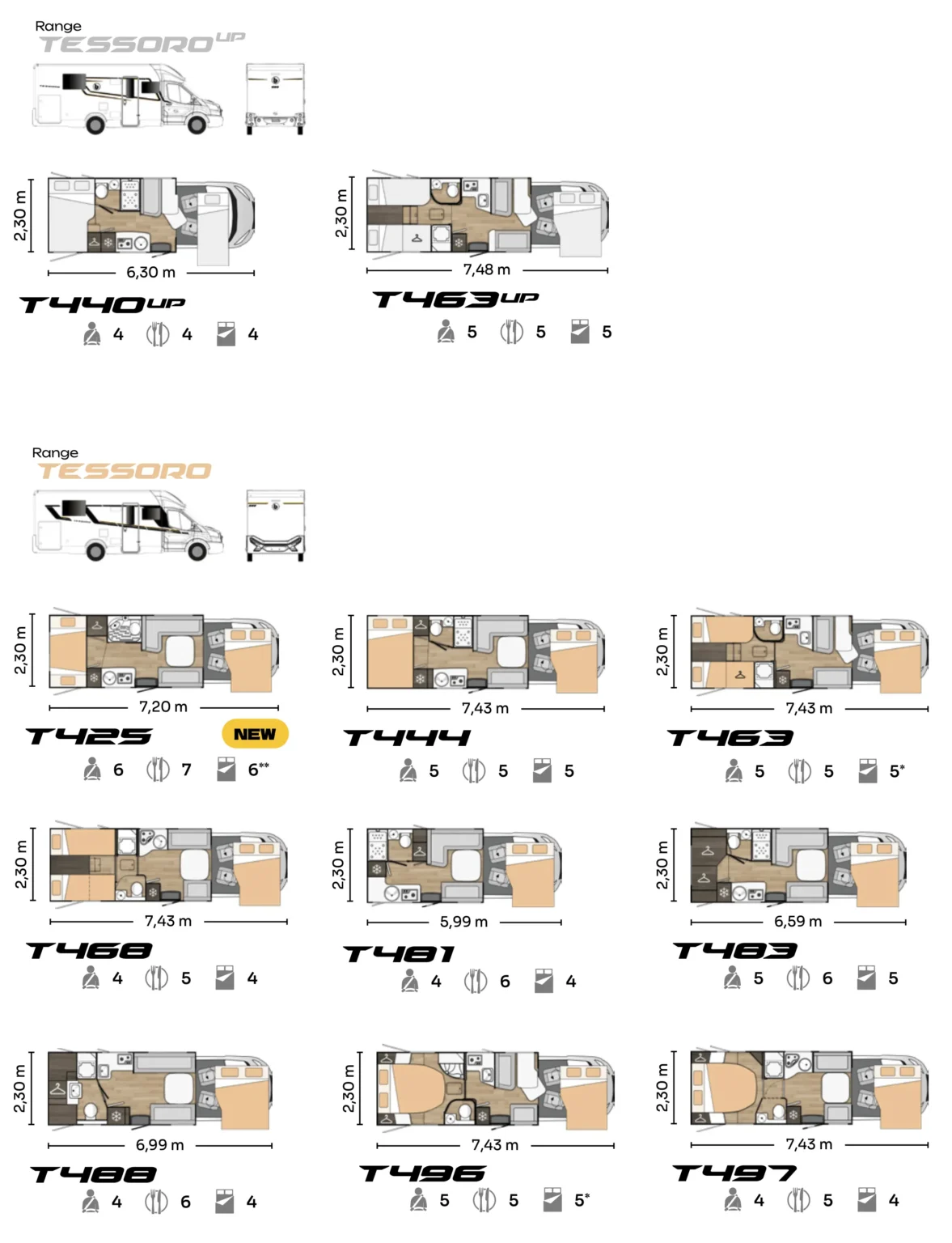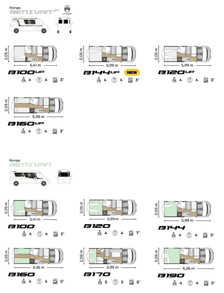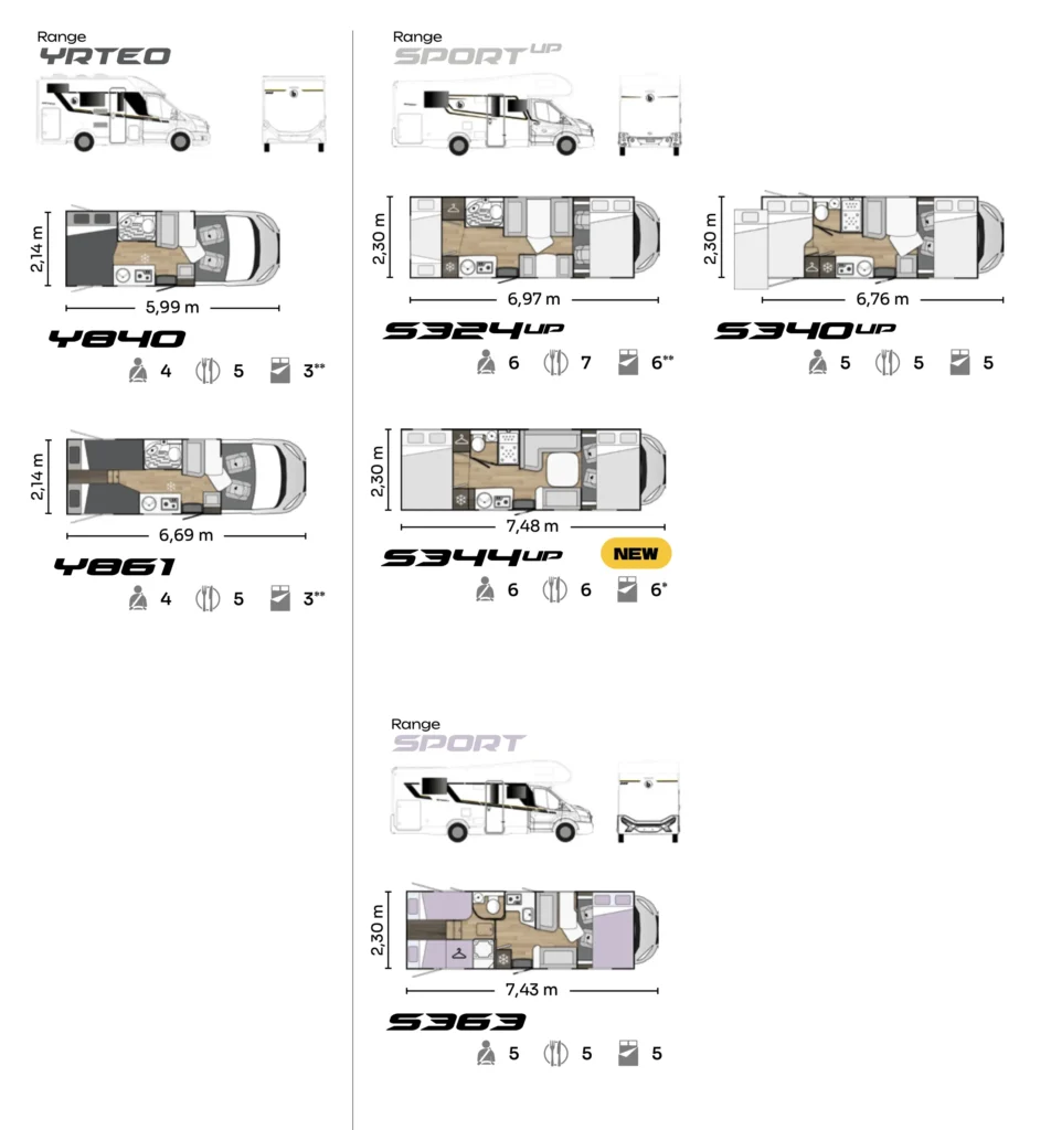 V sezoni 2026 bo na voljo šest različnih tlorisov. 4 tlorisi izmed njih bodo na voljo v UP izvedbi. UP izvedbe bodo na Citroenovi osnovi, ostale pa na Fiatovi. Pri vanih lahko izbiramo med osnovno izvedbo, plus paketom in Northautokapp paketom, ki letos vključuje tudi avtomatski menjalnik. Poleg paketov lahko opcijsko dodamo tudi pop-up streho(klasično belo ali črno v kombinaciji s panoramskim oknom spredaj. Lahko pa se odločimo tudi samo za panoramsko okno brez Pop-up strehe.