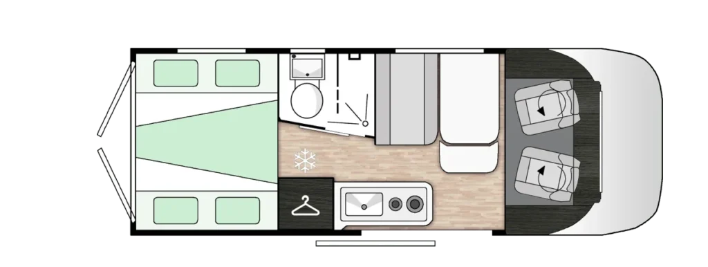 Kompakten in okreten van z dvema ležiščema, solarno celico, LED ambient osvetlitvijo, drsnimi vrati z mrežo proti komarjem in praktičnimi rešitvami za potovanja v dvoje ali manjše družine – vse v elegantni kombi obliki.