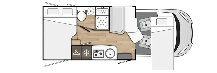 Kompakten in tehnološko dovršen avtodom z višinsko nastavljivo posteljo, velikim prtljažnim prostorom, avtomatskim hladilnikom, panoramskim oknom, digitalnimi števci ter brezžičnim Android Auto in Apple CarPlay – idealen za dinamična potovanja v dvoje ali z družino.